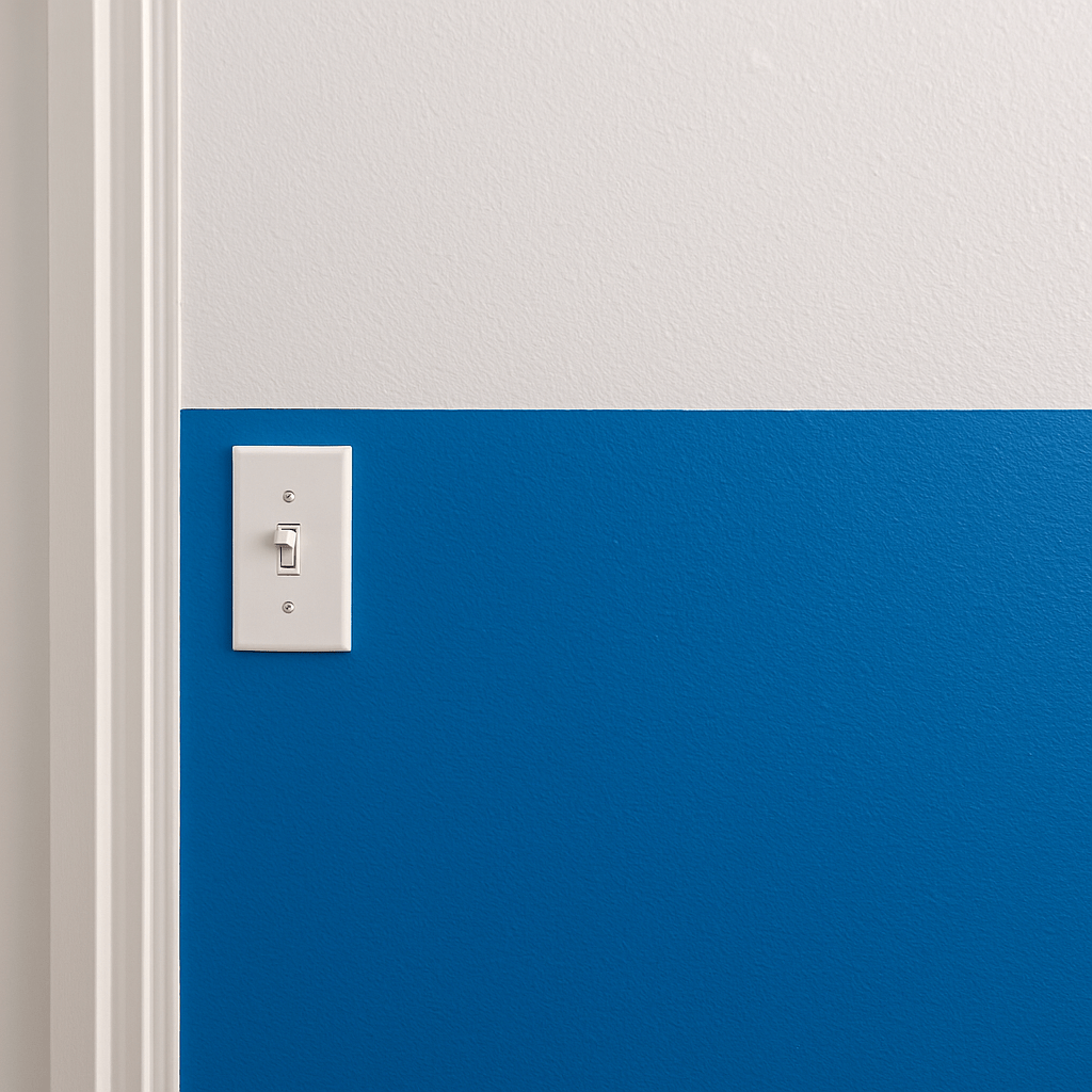 In this example, we show a wall with a precise color change between white and blue. The straight cut between the two shades demonstrates careful and professional work, without smudges or uneven edges.